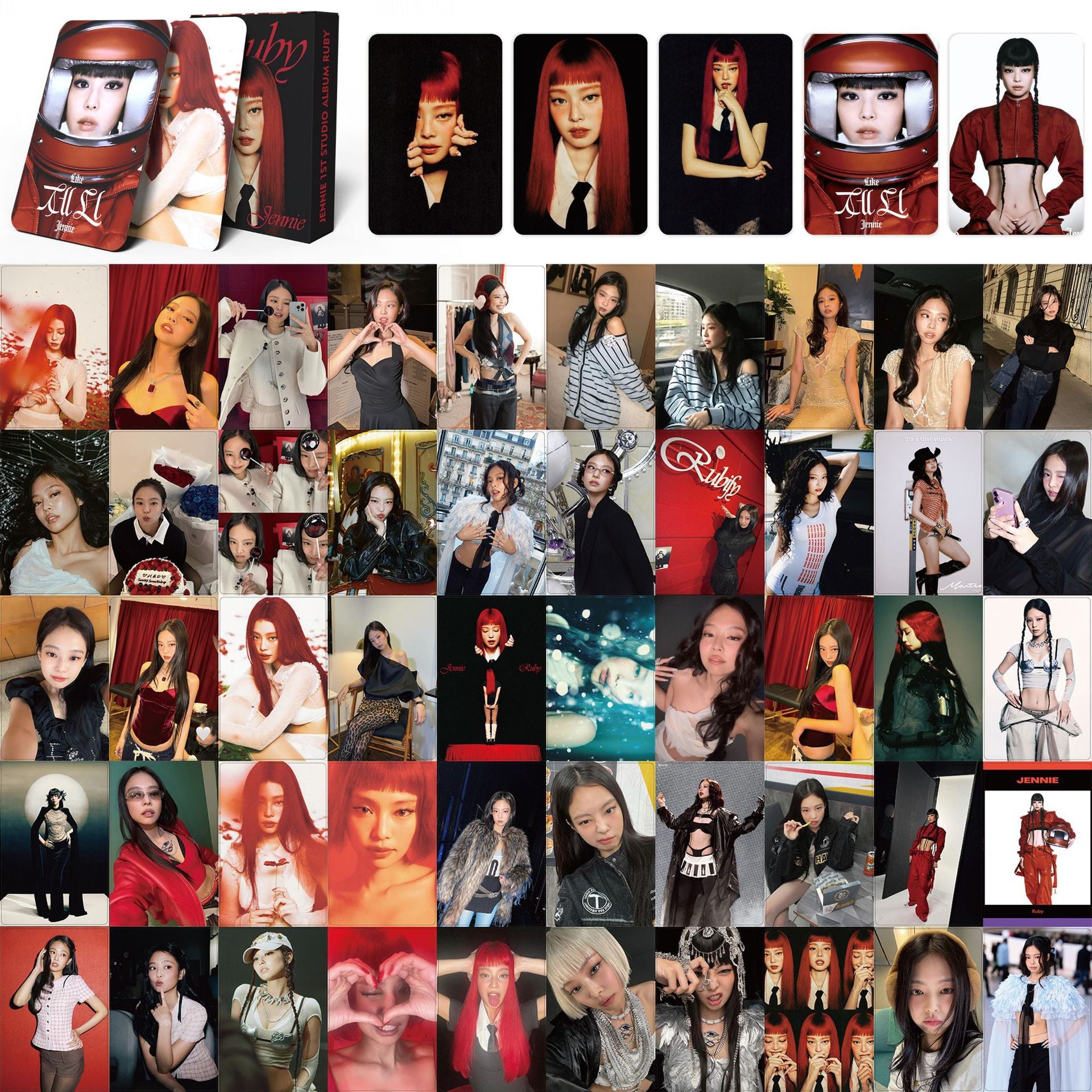 • Elevate your JENNIE collection with this exclusive 55-piece RUBY Album photocard set. Each card captures stunning imagery from the album, showcasing premium print quality and vibrant color reproduction. Perfect for collectors and fans seeking authentic merchandise, these photocards feature crisp details and professional finishing. Whether you're building a comprehensive collection or gifting to a fellow enthusiast, this comprehensive set delivers exceptional value. Display-ready and collectible, these cards represent a must-have addition to any serious fan's portfolio.