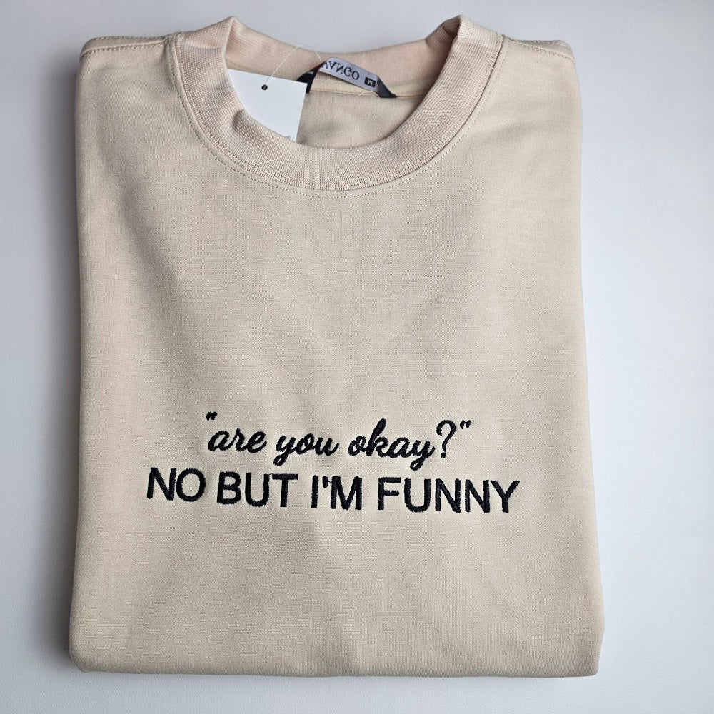 • Stay comfortable and express your unique vibe with the "are you okay? NO BUT I'M FUNNY" embroidered sweatshirt. Crafted for a relaxed fit, this sweatshirt combines cozy warmth with a playful statement, making it perfect for casual outings or lounging at home. The detailed embroidery adds a touch of quality and personality, ensuring you stand out effortlessly while staying snug.