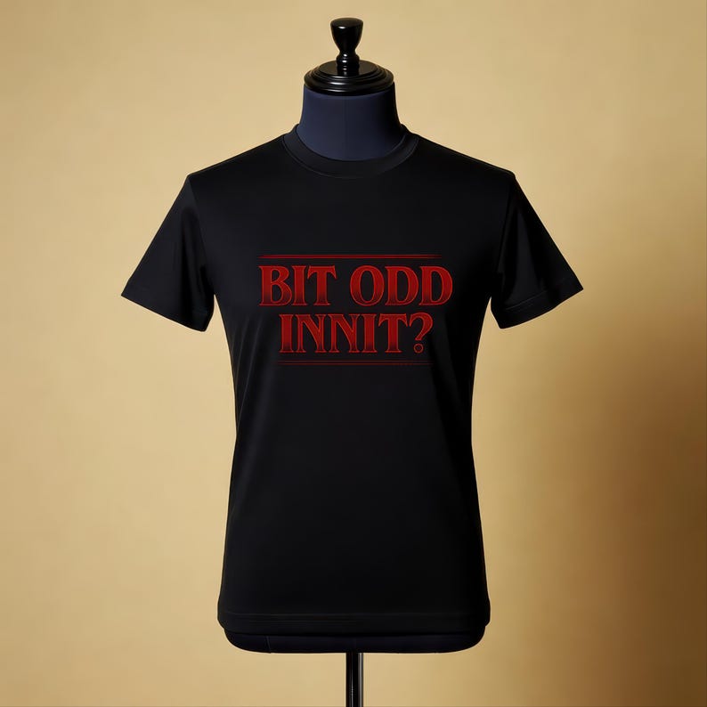 Bring eerie 80s vibes and deadpan UK humour together with this “Bit Odd Innit?” t shirt – a funny British slang Stranger Thiingss parody tee styled like a glowing horror title. Perfect for fans of the show, lovers of British sarcasm and anyone who enjoys subtle, nerdy references, this retro horror text top is a standout UK graphic shirt for everyday wear, gigs or pub nights. 👀✨