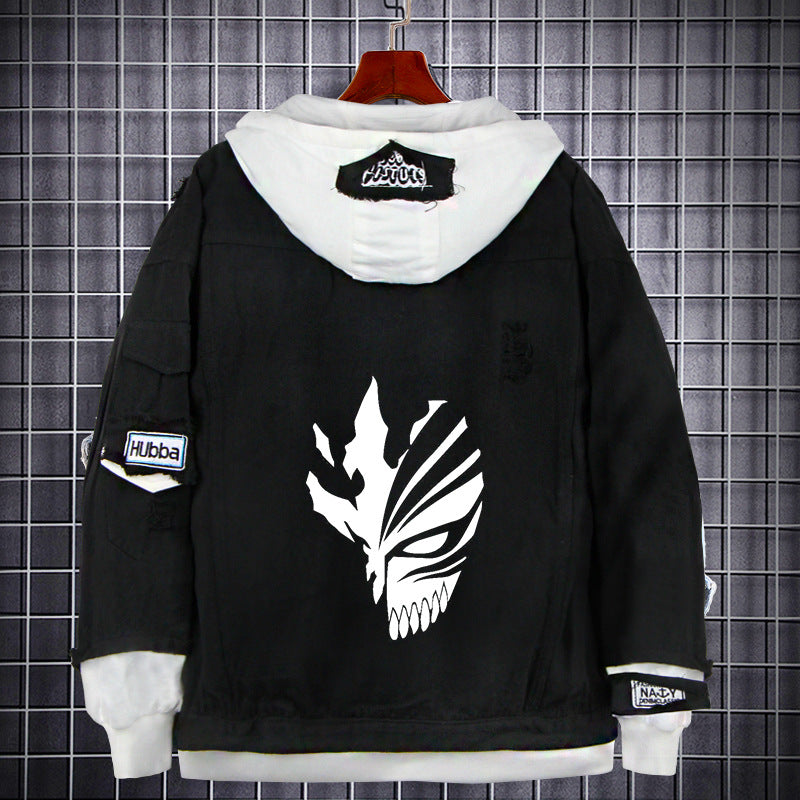 • This Casual Anime Hooded Denim Jacket is perfect for those looking for a relaxed fit. The loose design offers comfort and a stylish look. Show off your unique style with this fake two-piece jacket that combines fashion and comfort.