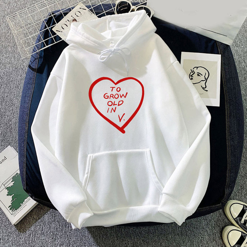 • This Casual TO GROW OLD IN V Printed Loose Hoodie features a convenient drawstring, providing adjustable comfort and freedom of movement. Perfect for everyday wear, this modern hoodie offers a practical and stylish addition to your wardrobe.
