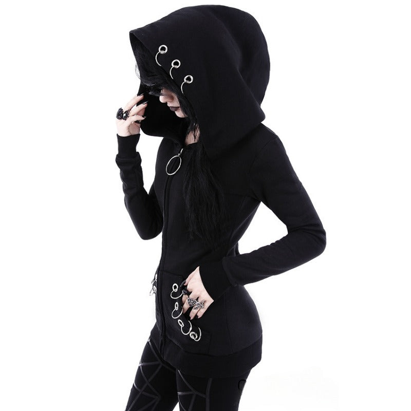 • Crafted from high-quality materials, the Chic Gothic Loose Iron Ring Zipper Black Hoodie offers both comfort and style. Featuring a spacious design and convenient pockets, this hoodie is perfect for everyday wear. Step up your fashion game with this must-have piece.