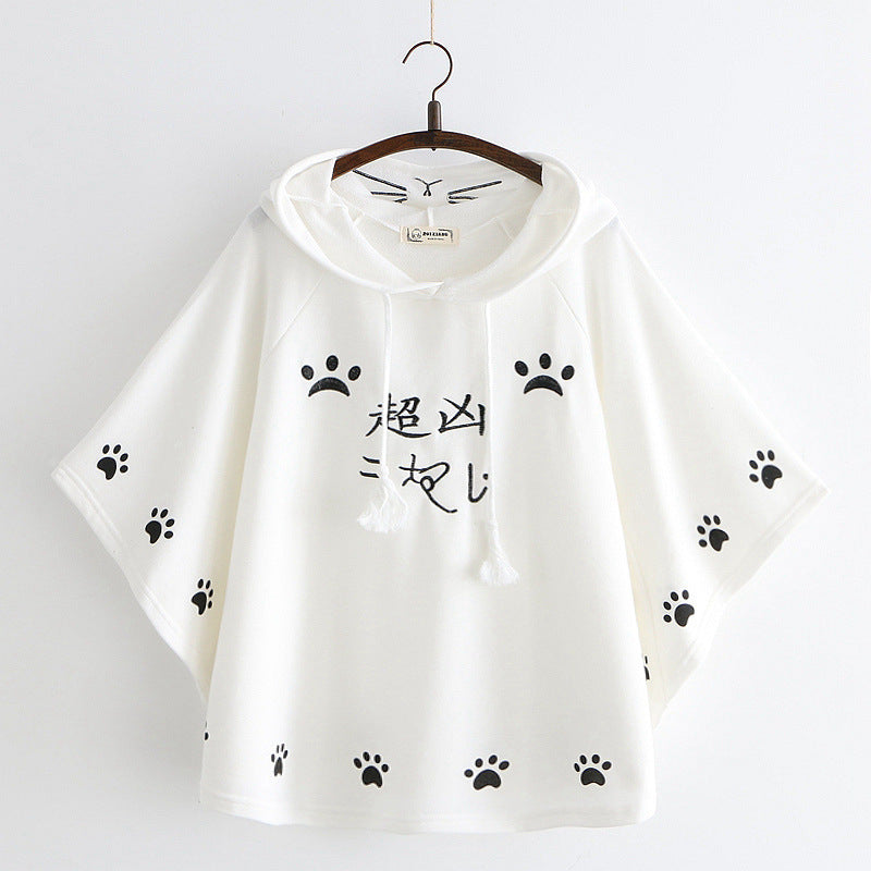 • This cute cartoon cat claws embroidered hooded cloak t-shirt features car ears hooded design with a drawstring for a comfortable and adjustable fit. The loose fit allows for easy movement and adds a touch of cuteness to any outfit. Perfect for any cat lover or fan of unique and fun fashion.