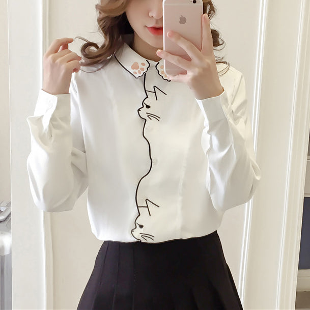 • Introducing the Cute Women's Cat Embroidered White Shirt. Adorned with a playful paws collar, this cozy shirt is purrfect for any feline lover. Stay comfortable and stylish with this unique addition to your wardrobe.