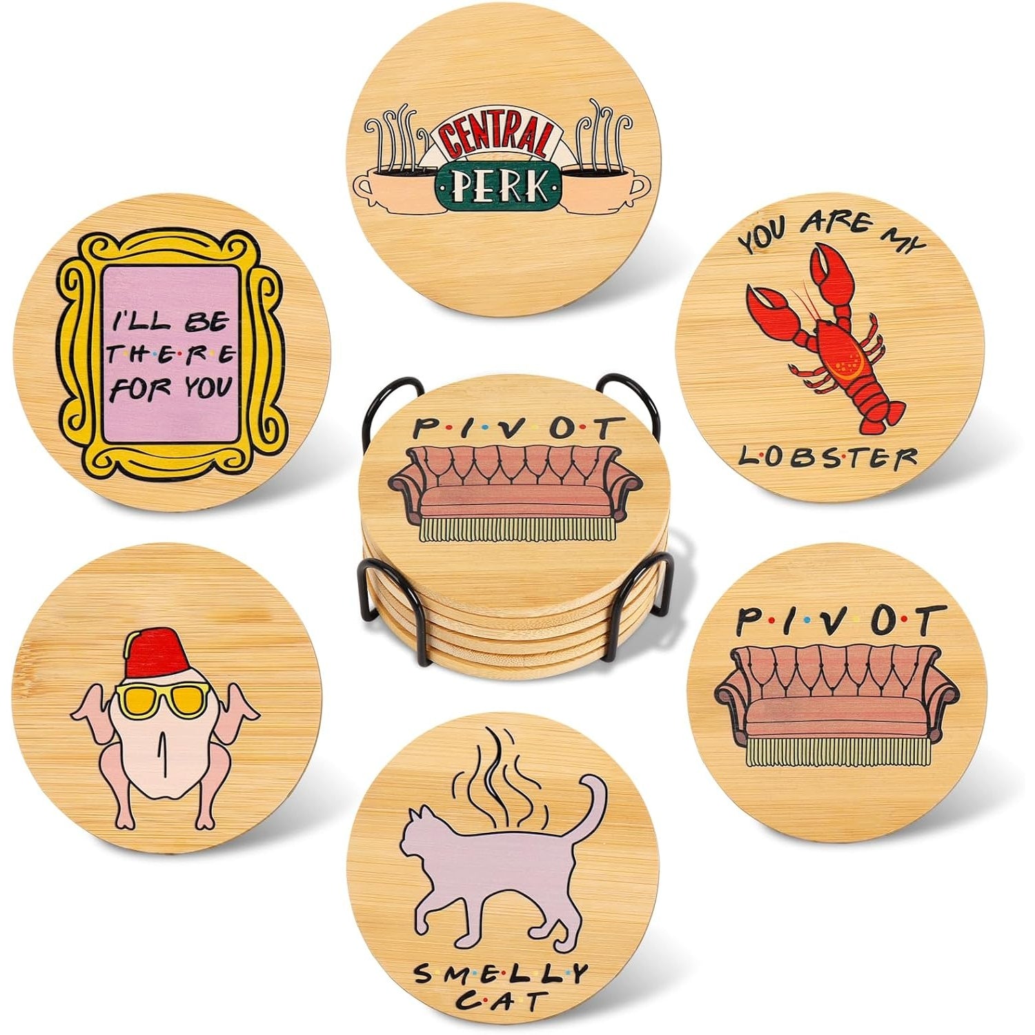 If you are looking for some novel Friends TV Show merchandise, then this set of friends coasters integrated into the Friend TV Show style must be your first choice.Friends coasters set is inspired from Friends Tv Show,Design the most popular props, slang, dialogues for each drinks coaster.Friends TV coaster for fans in the world.