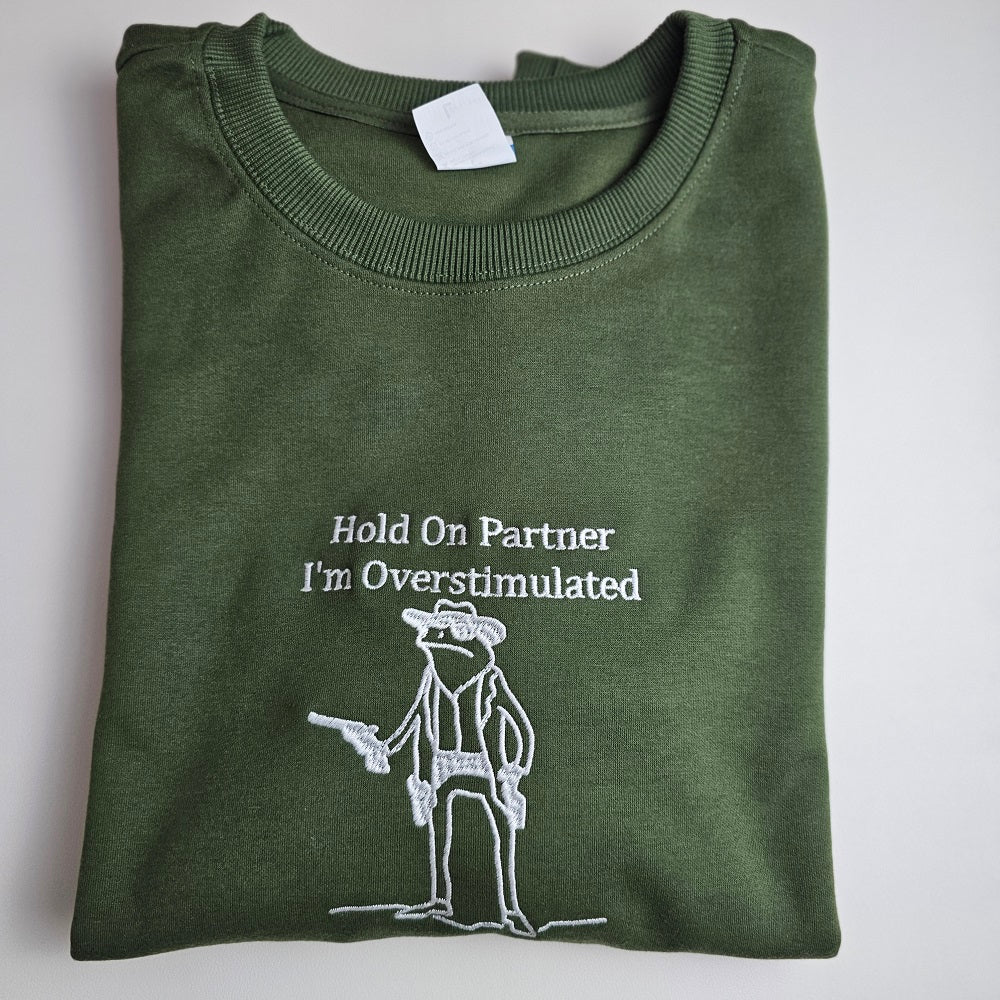 • This embroidered sweatshirt combines comfort with a bold statement, featuring the phrase "Hold On Partner, I'm Overstimulated." Crafted from soft, durable fabric, it offers a cozy fit ideal for casual wear or layering. The detailed embroidery adds a refined touch, making it a standout piece that expresses personality while ensuring lasting quality. Perfect for those who appreciate both style and comfort in their wardrobe.