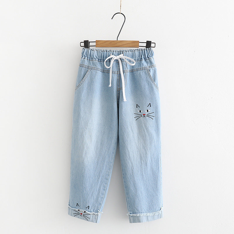• Achieve a comfortable and stylish look with our Japanese Style Cartoon Beard Cat Embroidered Denim Pants. These pants feature a convenient drawstring closure and a loose fit, providing both functionality and fashion. Perfect for any occasion, elevate your wardrobe with these unique and playful pants.