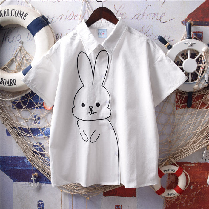 • This Japanese Style Cute Rabbit Embroidery Collar Short Sleeved Shirt is a versatile and stylish addition to any wardrobe. The loose fit provides comfort and flexibility, while the white color adds a touch of elegance. Perfect for any occasion, this shirt is sure to impress with its unique embroidery collar design.