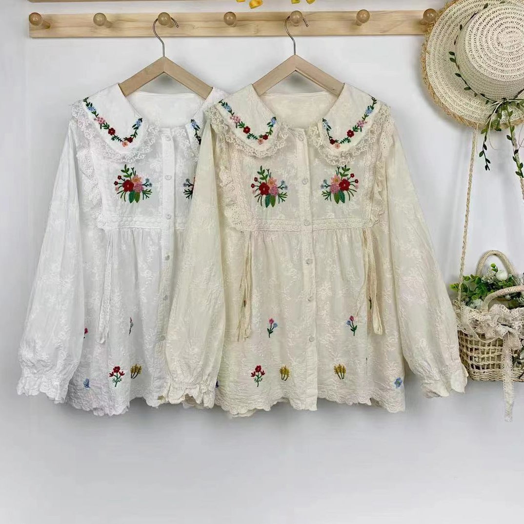 • This vintage Japanese style shirt features intricate floral embroidery and a loose fit for a unique and high-quality look. Perfect for adding a touch of elegance to any outfit. Expertly crafted with attention to detail, this shirt is sure to become a wardrobe staple.