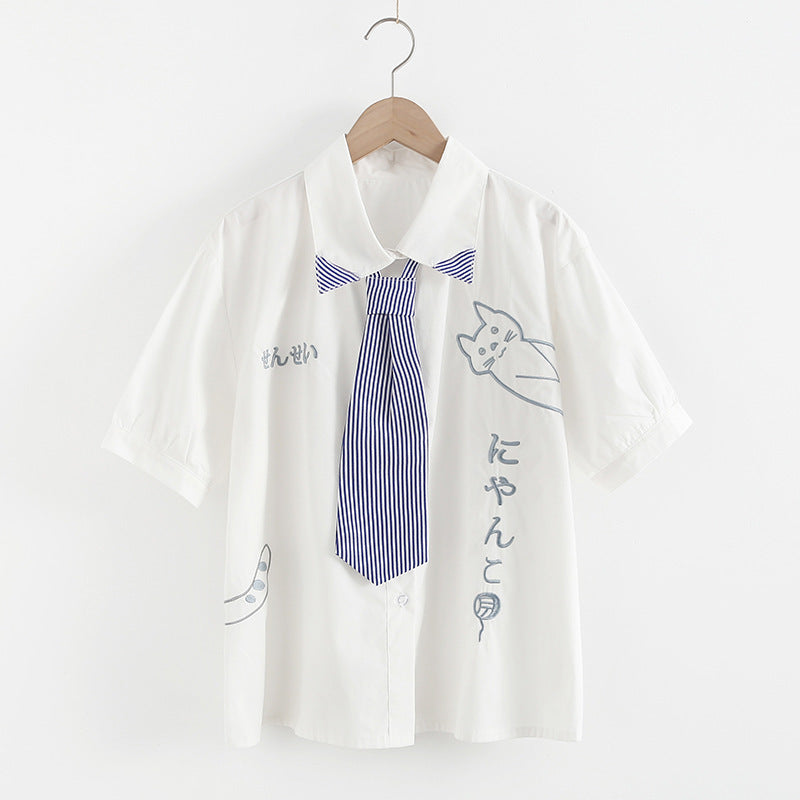 • Indulge in Japanese style with our Kawaii Polo Tie Cat Embroidered Short Sleeve White Shirt. Featuring charming buttons and expertly embroidered with a playful cat design, this shirt will add a touch of cuteness to any outfit. Elevate your fashion game with this unique piece.