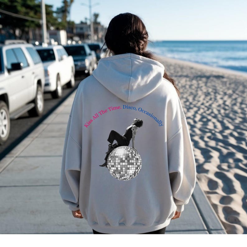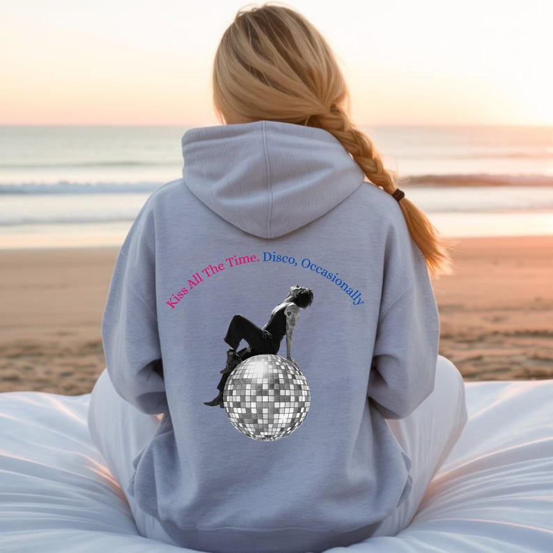 Our "Kiss All The Time, Disco Occasionally" hoodie is the definitive piece for those who live for music, freedom, and the eternal glow of a night under the "mirror ball". With an artistic aesthetic that celebrates romance and party vibes, this hoodie captures the essence of modern pop mixed with vibrant 70s nostalgia.