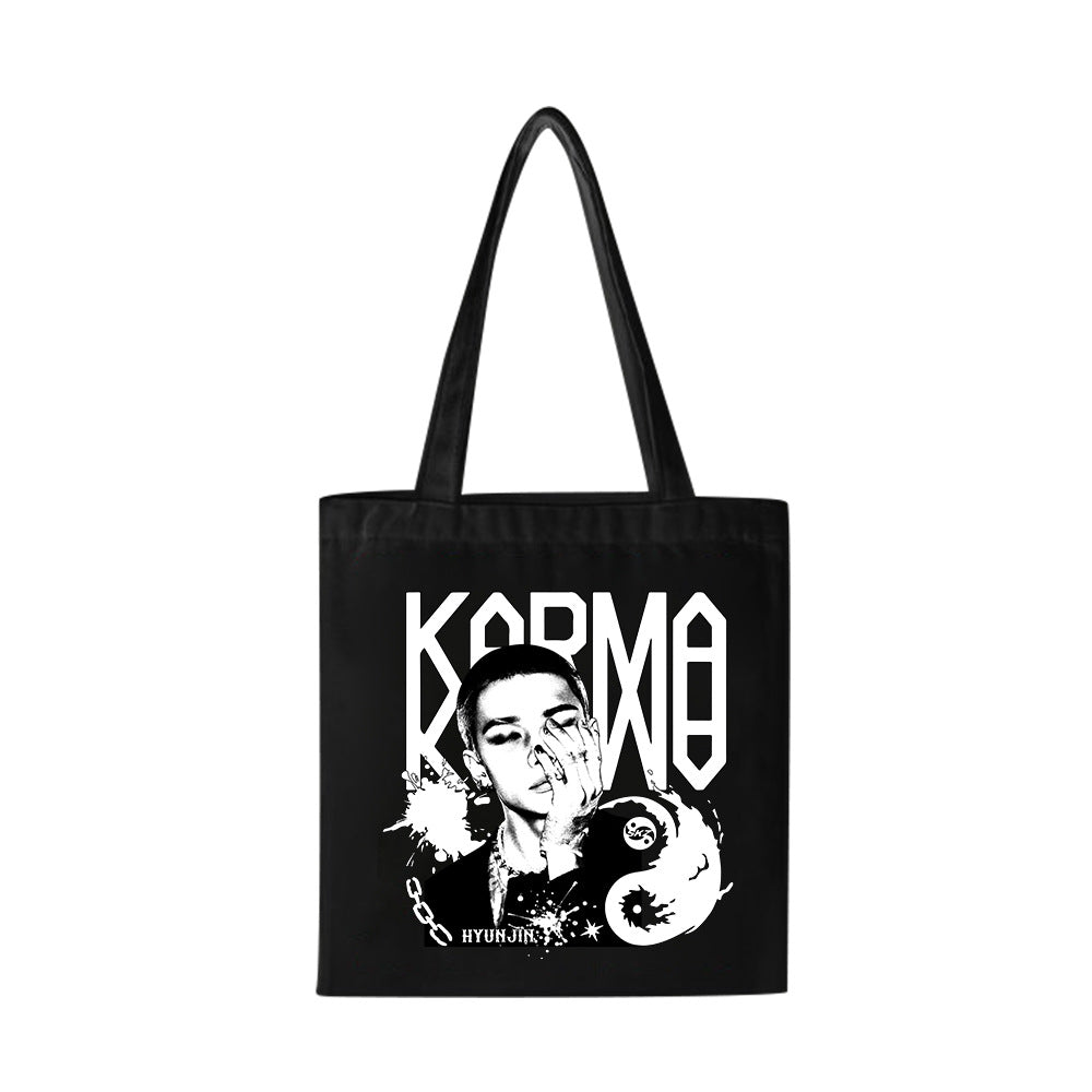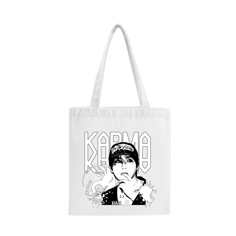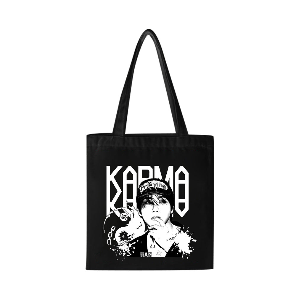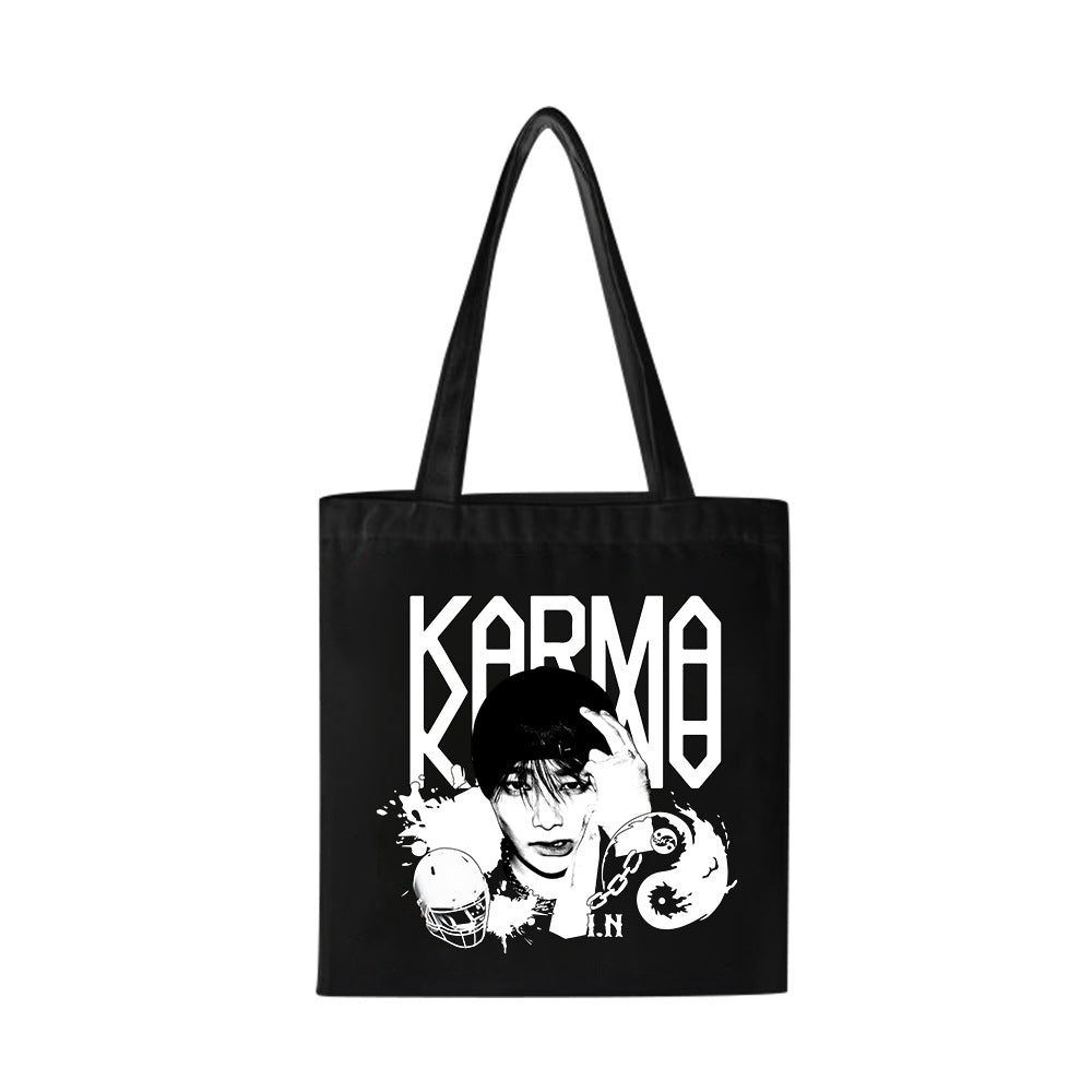 • Carry your love for KPOP KARMA with this Ink Poster Tote Bag. Made from durable fabric, it offers ample space for your daily essentials while showcasing a unique ink poster design that stands out. Perfect for fans who want to blend style and functionality effortlessly.