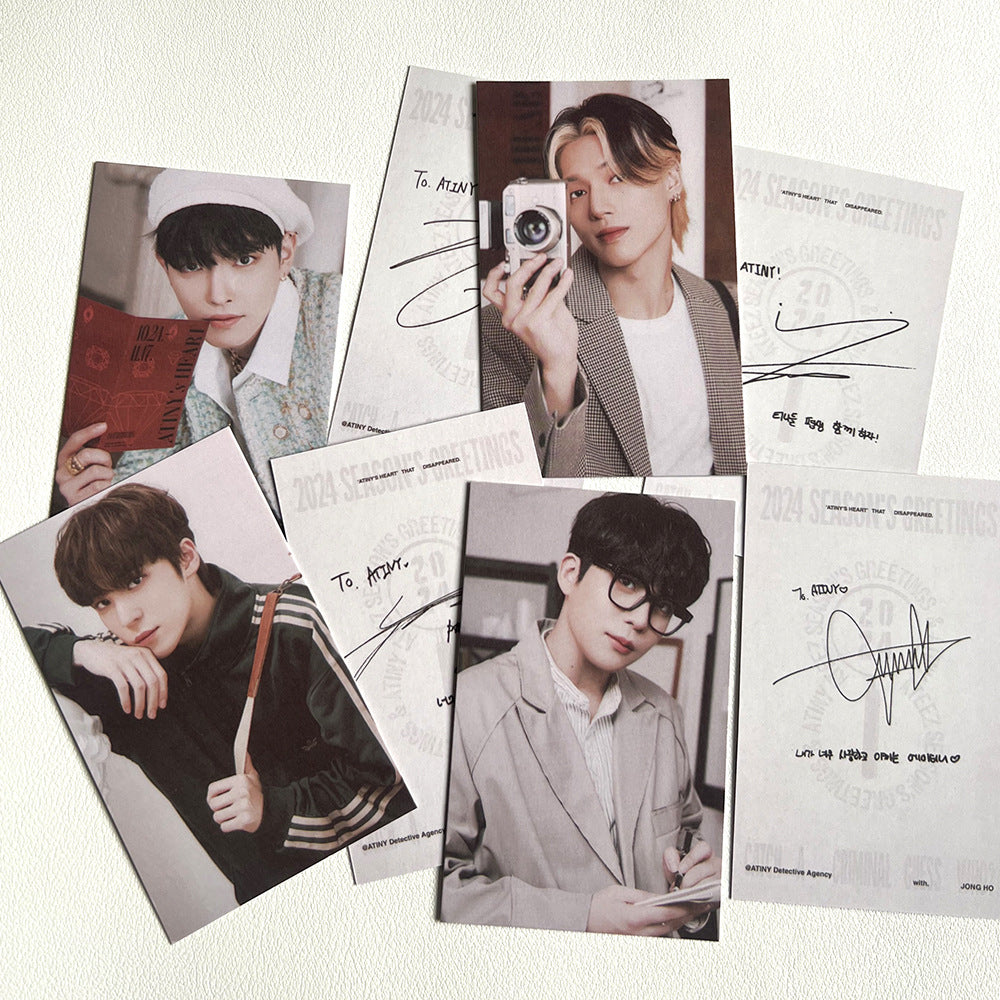 • Introducing the Kpop Season's Greetings Postcard, featuring a cute design that will bring a smile to your face. Perfect for sending to friends and family or collecting as a fan. Add a touch of charm to your correspondence with this delightful postcard.