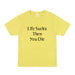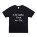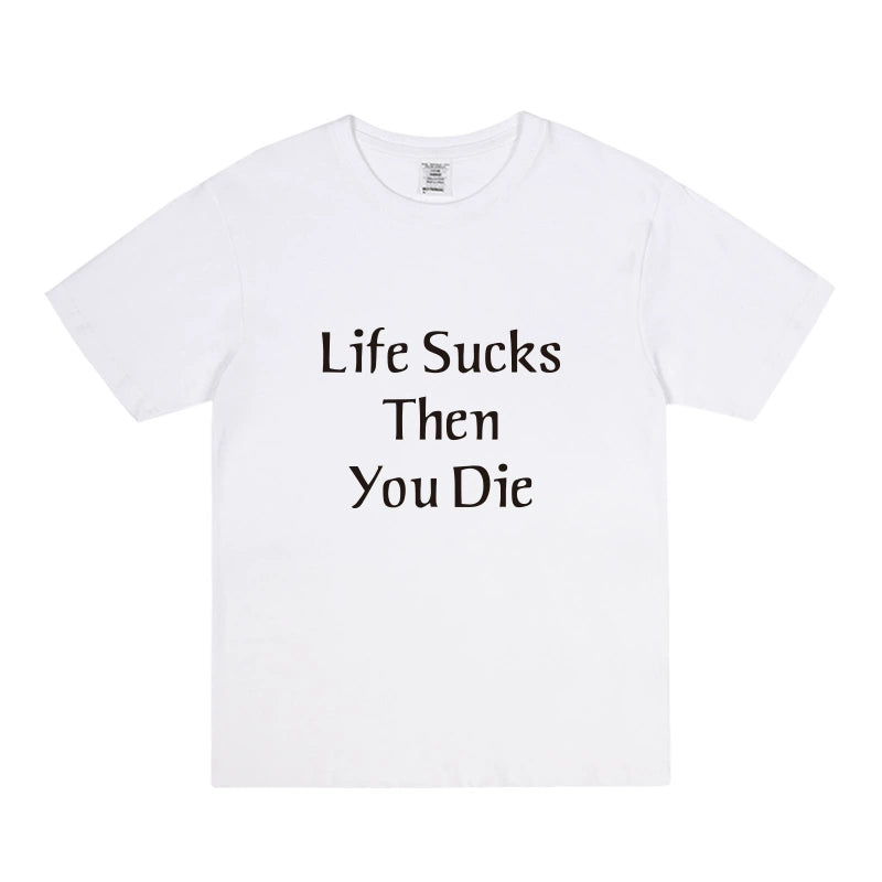 • This LIFE SUCKS THEN YOU DIE T-shirt is made with comfortable and breathable cotton fabric. The loose fit allows for maximum comfort and movement, making it perfect for everyday wear. Embrace the irony with this tongue-in-cheek design.