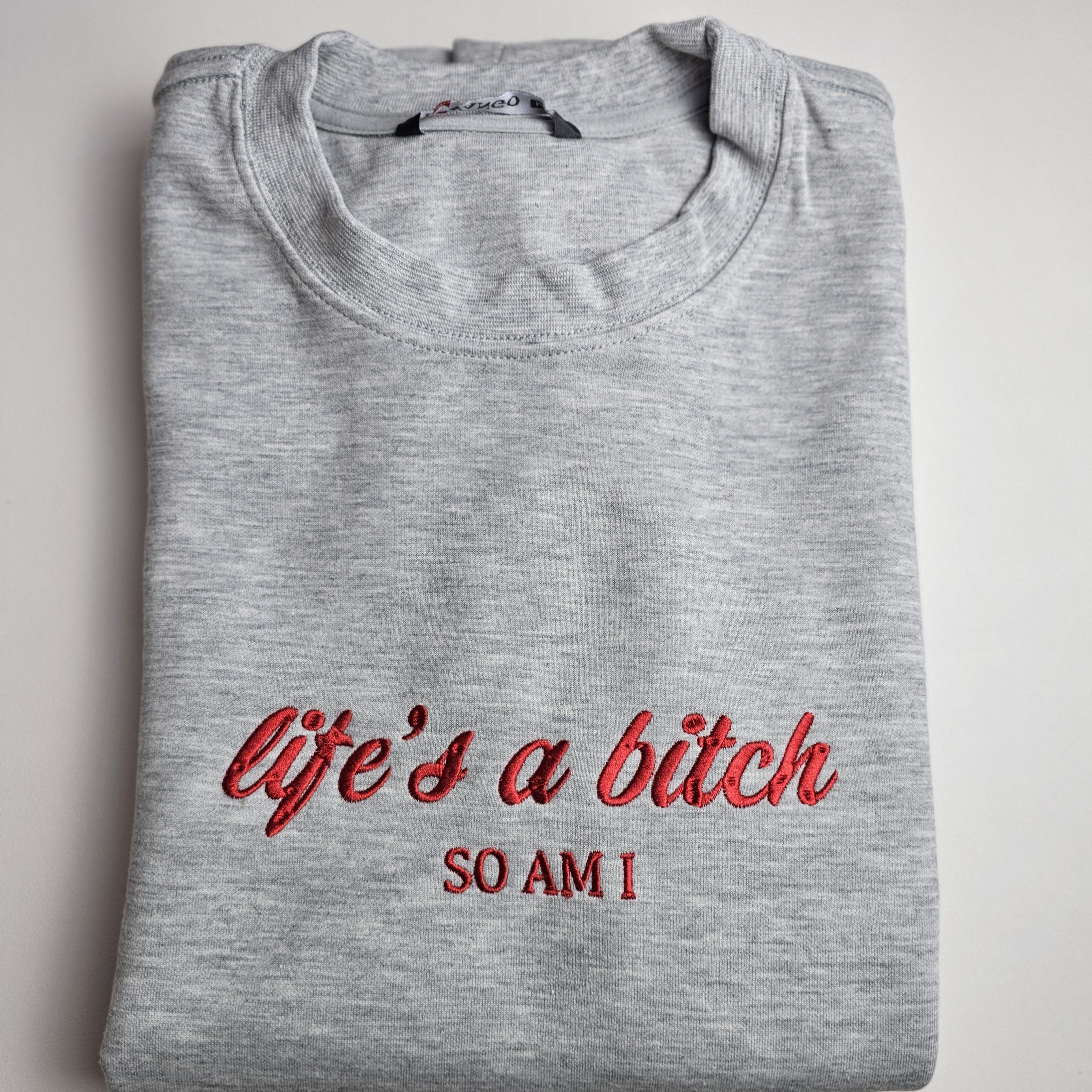 • Embrace your bold side with the Life's A Bitch SO AM I Embroidered Sweatshirt. Crafted for comfort and style, this sweatshirt features high-quality embroidery that makes a confident statement. Perfect for casual wear, it combines softness with durability, ensuring you stay cozy while expressing your attitude effortlessly.
