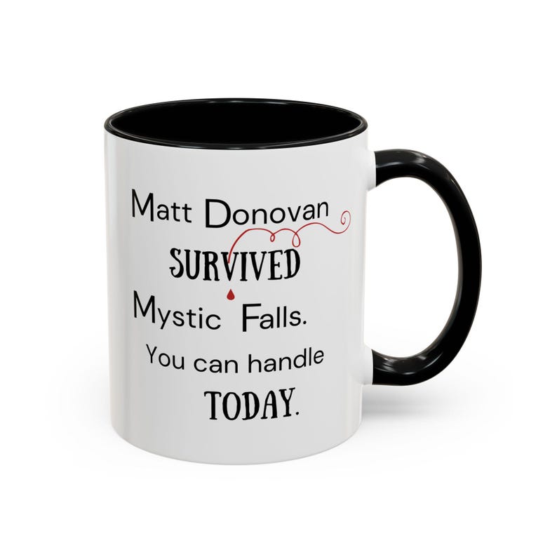 Take on the day with our Vampire Diaries-inspired mug! Featuring the cheeky slogan, "Matt Donovan Survived Mystic Falls. You Can Handle Today," this mug is perfect for fans of the show who love to hate Matt Donovan, while also celebrating the resiliancy of the human spirit.