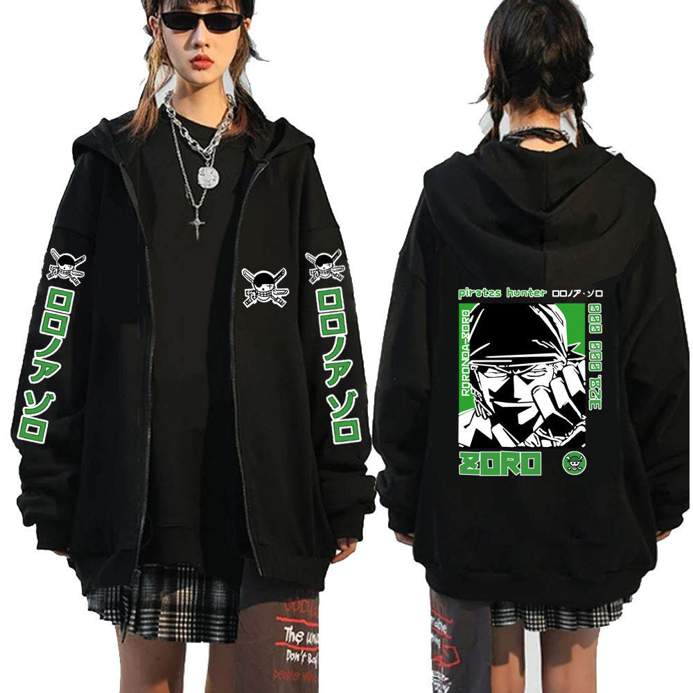 • This unisex Zoro Print Zipper Hoodie combines comfort with iconic anime style. Featuring high-quality printing of the legendary swordsman, it's crafted from durable, soft fabric that maintains its shape after multiple washes. The full zipper design offers versatile styling options, while ribbed cuffs and hem ensure a secure fit. Perfect for casual outings or adding a distinctive touch to your everyday wardrobe.