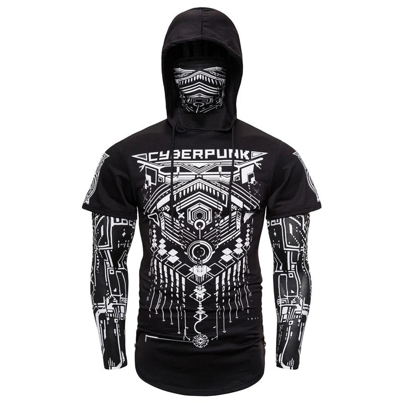 • This men's fitness mask fake two-piece graphic stretch hooded long sleeve shirt is designed for a perfect fit. The hood adds a cyberpunk touch to your workout outfit. Stay comfortable and stylish during your fitness routine.