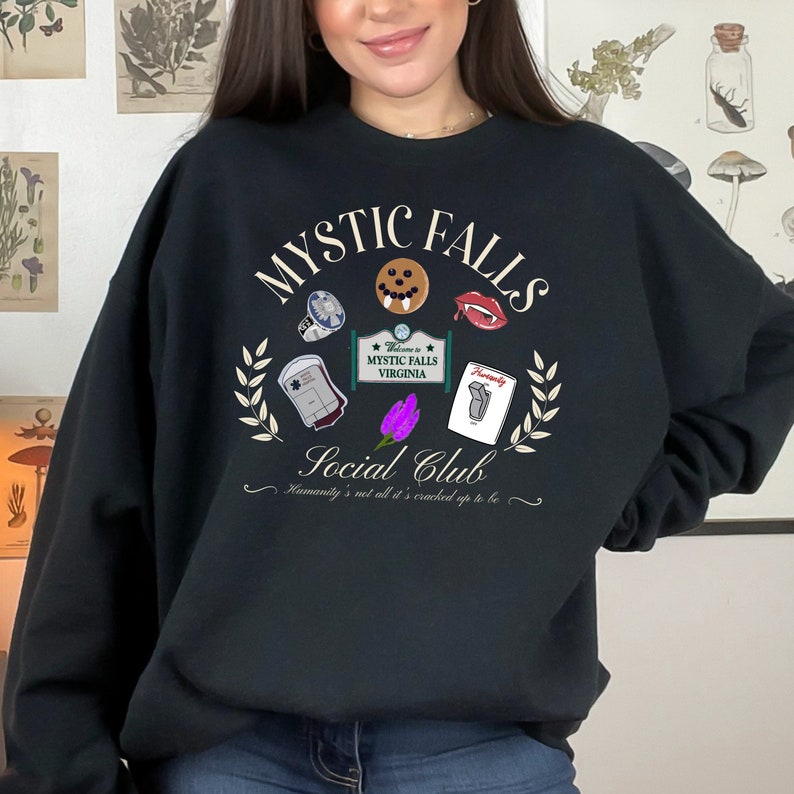 • Introducing the Mystic Falls Social Club Sweatshirt - the perfect addition to your casual wardrobe. Made for comfort and style, this sweatshirt is a versatile piece that can be dressed up or down. Stay cozy while making a statement with this must-have sweatshirt.