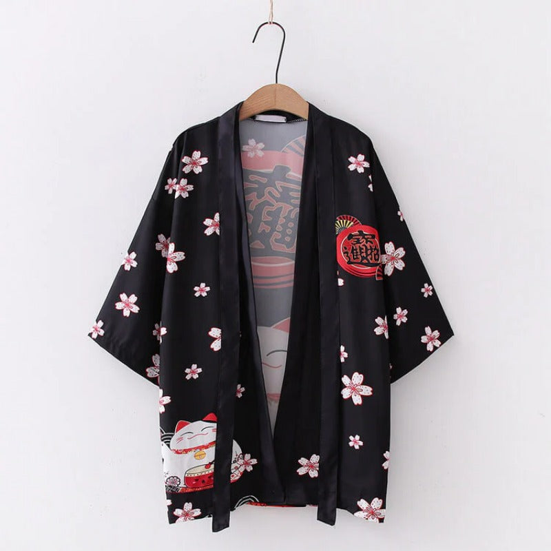 • This Retro Japanese Style Funny Cat Loose Kimono is the perfect way to stay fashionable while expressing your playful personality. The beautiful floral pattern creates contrast and a unique look while the short-sleeve design ensures comfort and breathability. Add some fun to your wardrobe with this high-quality kimono.