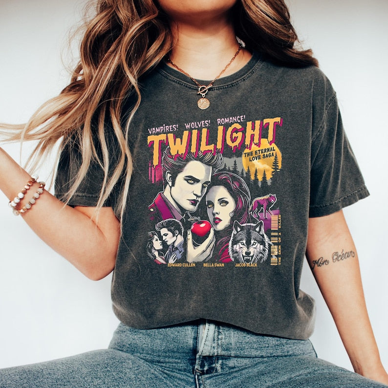 • Embrace timeless comfort with the Retro Twilight Saga Printed Crew Neck T-shirt. Crafted for a cozy fit, this tee features a nostalgic design that celebrates the iconic Twilight series. Its soft fabric ensures all-day wearability, making it perfect for casual outings or relaxed evenings. Ideal for fans seeking both style and comfort in one classic piece.