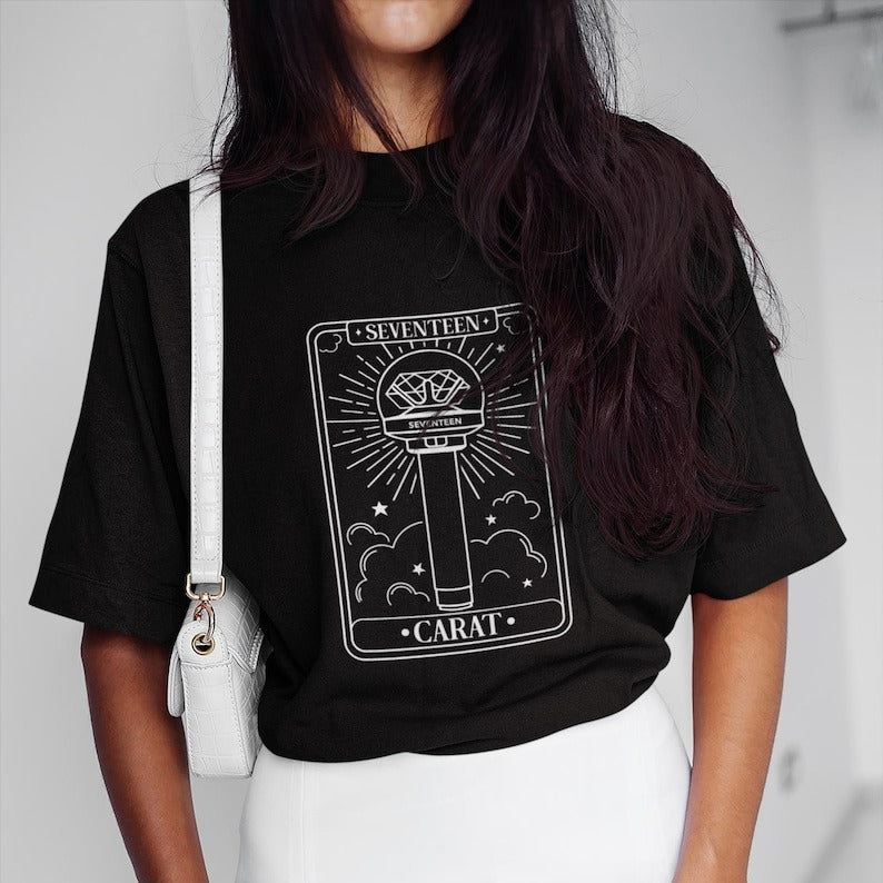 • This Seventeen Lightstick Tarot Unisex Cotton Tee offers both comfort and style, crafted from soft, breathable cotton. Designed to suit all genders, it provides a relaxed fit ideal for everyday wear. Featuring a distinctive lightstick tarot-inspired graphic, this tee allows fans to showcase their passion with subtle sophistication while enjoying lasting comfort.