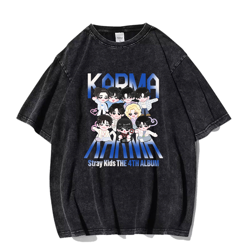 • The KPOP KARMA Character LOGO Printed Washed T-shirt combines casual style with a vintage vibe, featuring a distinctive washed finish that adds character to your everyday look. Crafted for comfort and durability, this tee showcases a bold logo print that reflects your passion for K-pop culture. Perfect for fans seeking a relaxed yet stylish wardrobe staple.