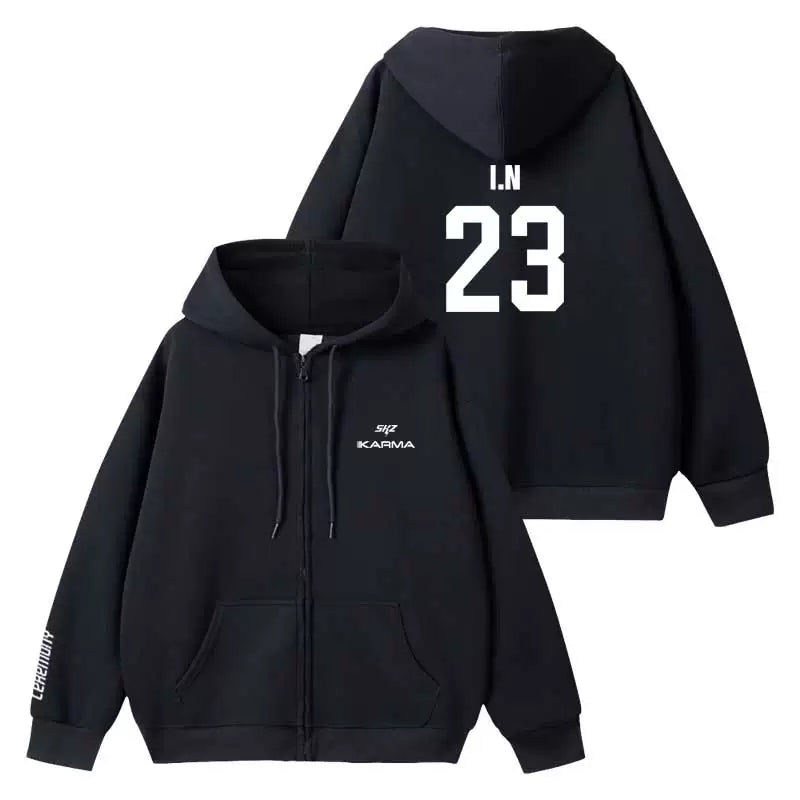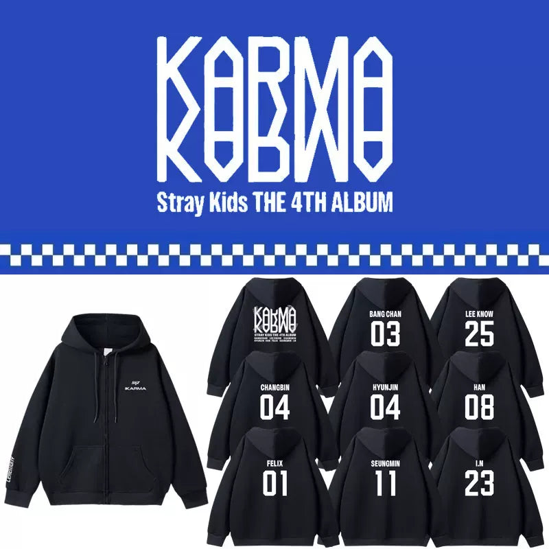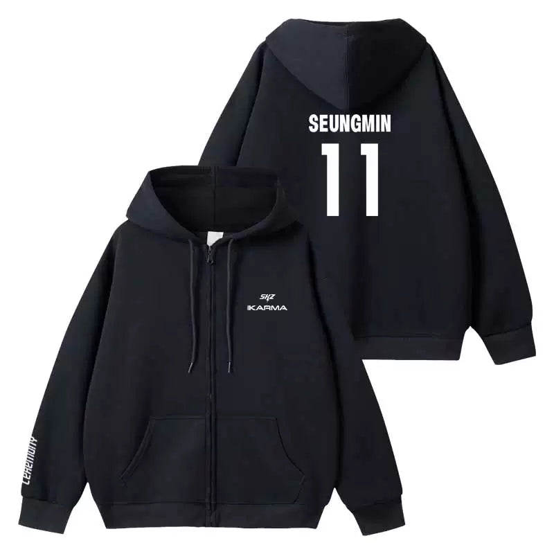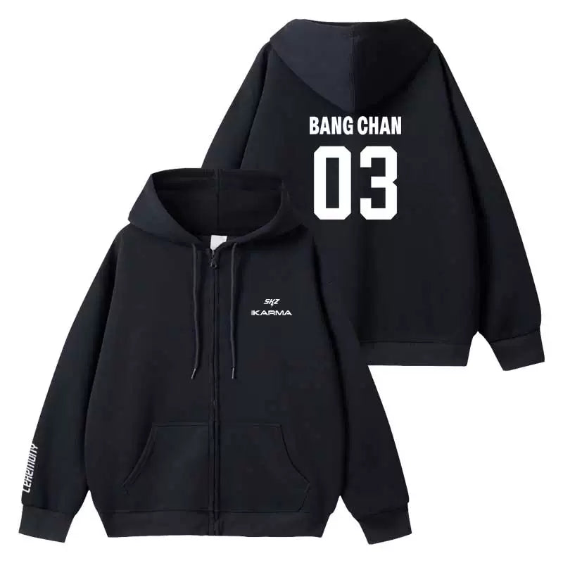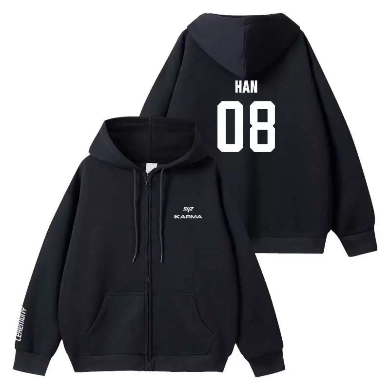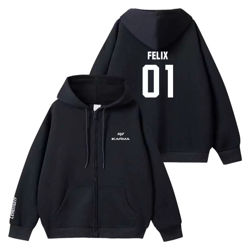 Embrace your inner rebel with this sleek black hoodie inspired by KARMA energy. Featuring a bold zipper design and premium comfort, it's the perfect piece for SKZ fans who want to make a statement. The classic black colorway pairs effortlessly with any outfit, while the quality construction ensures durability through countless wears. Whether you're heading to a concert or keeping it casual, this hoodie delivers both style and substance. Channel that confident, edgy vibe wherever you go.