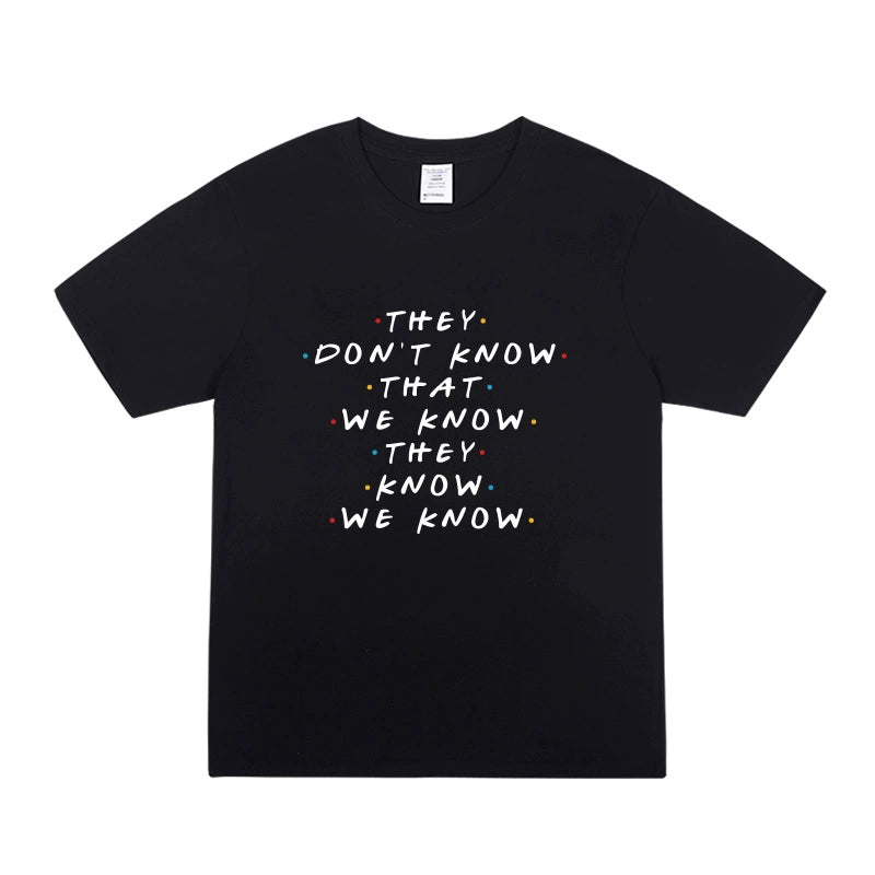 • This casual t-shirt is perfect for any occasion. Its comfortable fabric and stylish design make it a must-have for your wardrobe. Let them know you're in on the secret with the "They Don't Know That We Know" letter print. Perfect for any day, any time.