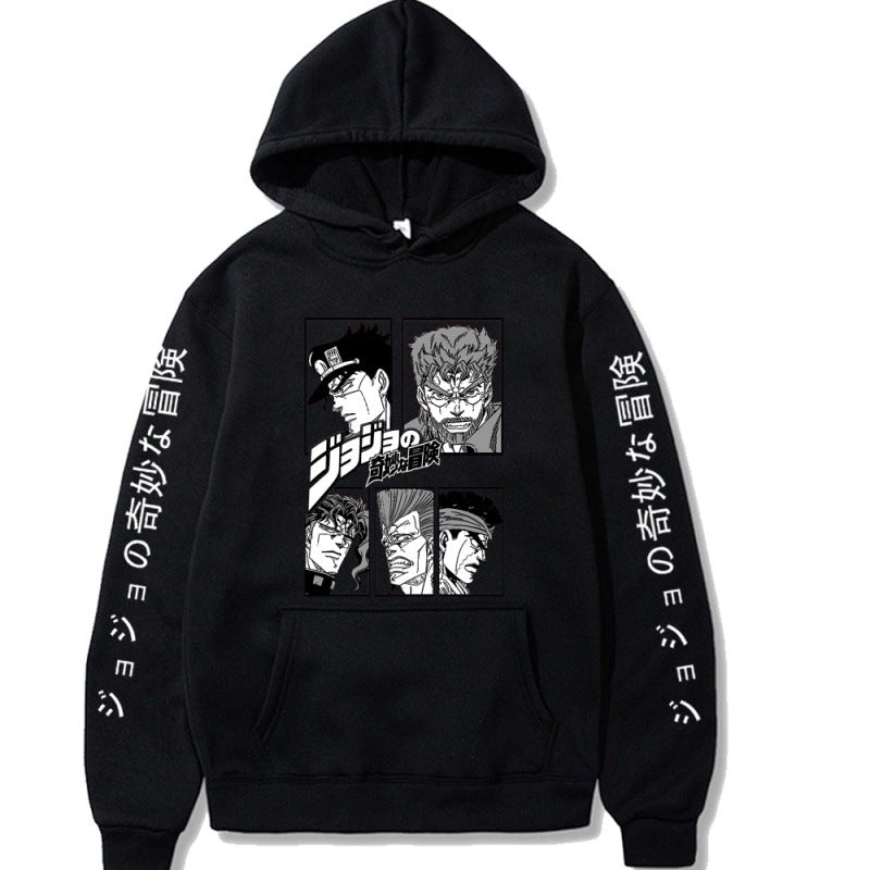 • This unisex hoodie features a loose fit, providing maximum comfort and easy styling for any body type. With a bold graphic print inspired by the popular Jojo anime series, this casual hoodie is perfect for fans and fashion-forward individuals alike. Stay stylish and comfortable with this must-have wardrobe staple.