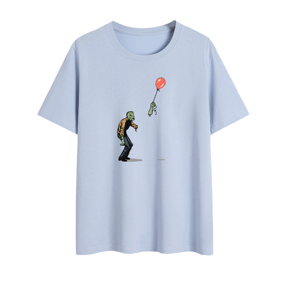 • This unisex oversized t-shirt is perfect for Halloween with its walking zombie balloon design. Made of loose, comfortable fabric and featuring a round neck, this casual t-shirt is a must-have for any zombie fan.