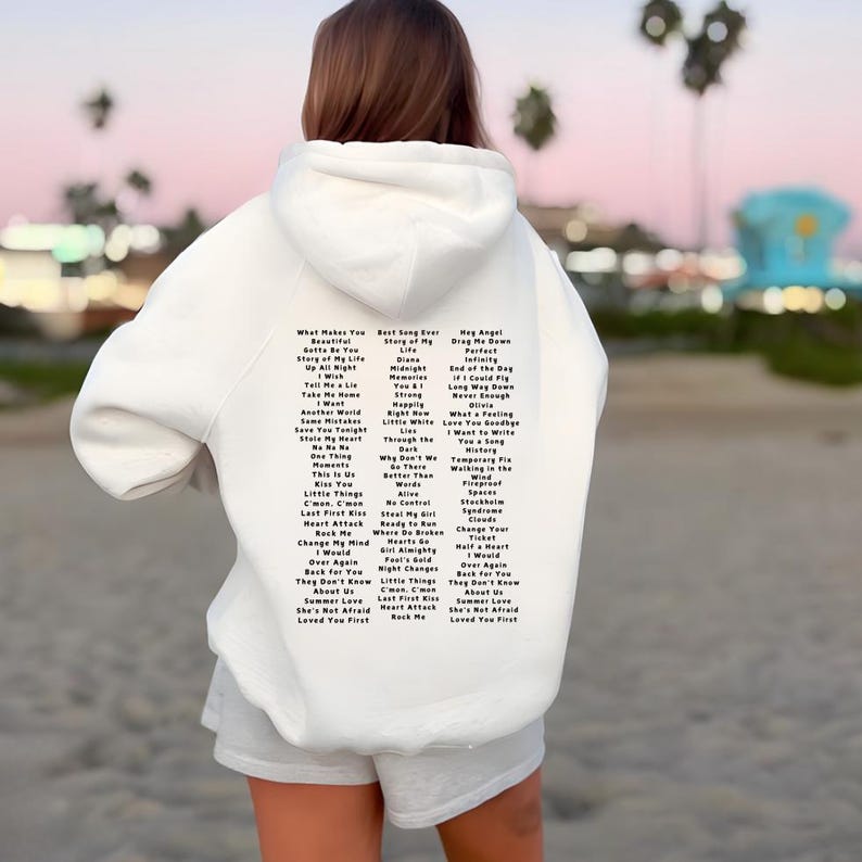 • This women's 1D Tracklist Print Hoodie provides a comfortable and stylish loose fit, perfect for casual wear. Stay cozy and effortlessly cool with this must-have hoodie.