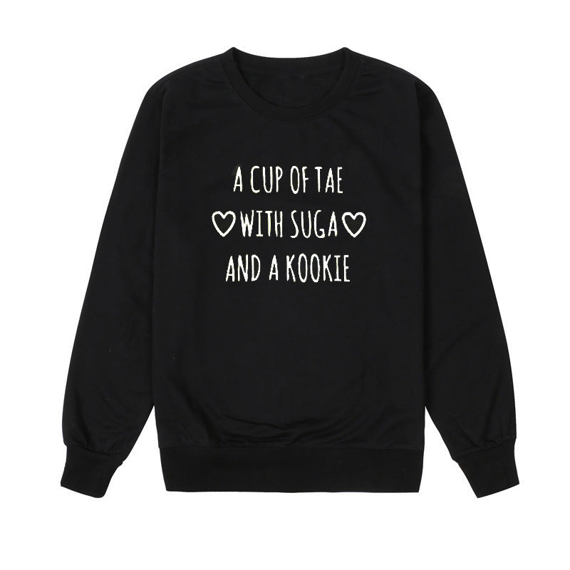 • Stay warm and comfortable with our Women's "A CUP OF TAE WITH SUGA AND A KOOKIE" Round Neck Sweatshirt. Made with a cozy and loose fit, this sweatshirt is perfect for lounging at home or running errands. A must-have addition to your wardrobe.