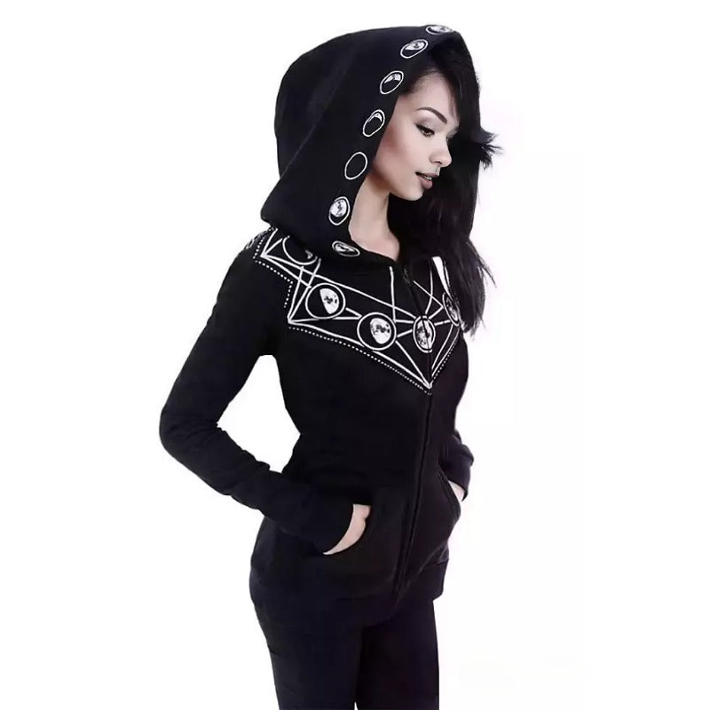 • Effortlessly combine style and comfort with our Women's Dark Style Gothic Black Moon Printed Hoodie. The slim fit and zip up design offer a flattering and functional look, while the added pockets provide convenience. Get ready to make a statement with this unique and trendy hoodie.
