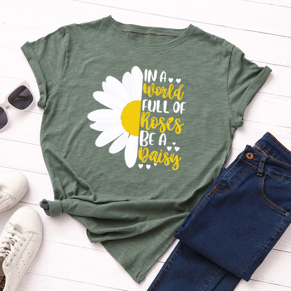 • This stylish graphic t-shirt features a bold statement, "In a world full of roses, be a daisy". With its multi-color design and loose fit, it offers both comfort and fashion. Its round neck adds a classic touch to this trendy piece. Show off your unique style and empowering message with this t-shirt.